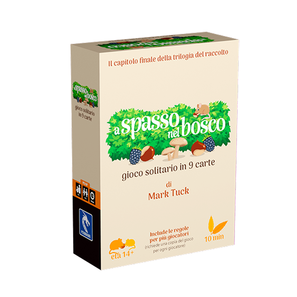 A Spasso nel Bosco gioco di carte è un viaggio solitario tra le fronde di un bosco rigoglioso, dove ogni carta giocata diventa un passo tra radure, funghi e dolci more selvatiche. Ultimo capitolo della trilogia di microgiochi iniziata con Orchard e Grove, questo titolo cattura il fascino della natura e lo trasforma in un’esperienza di strategia e contemplazione.